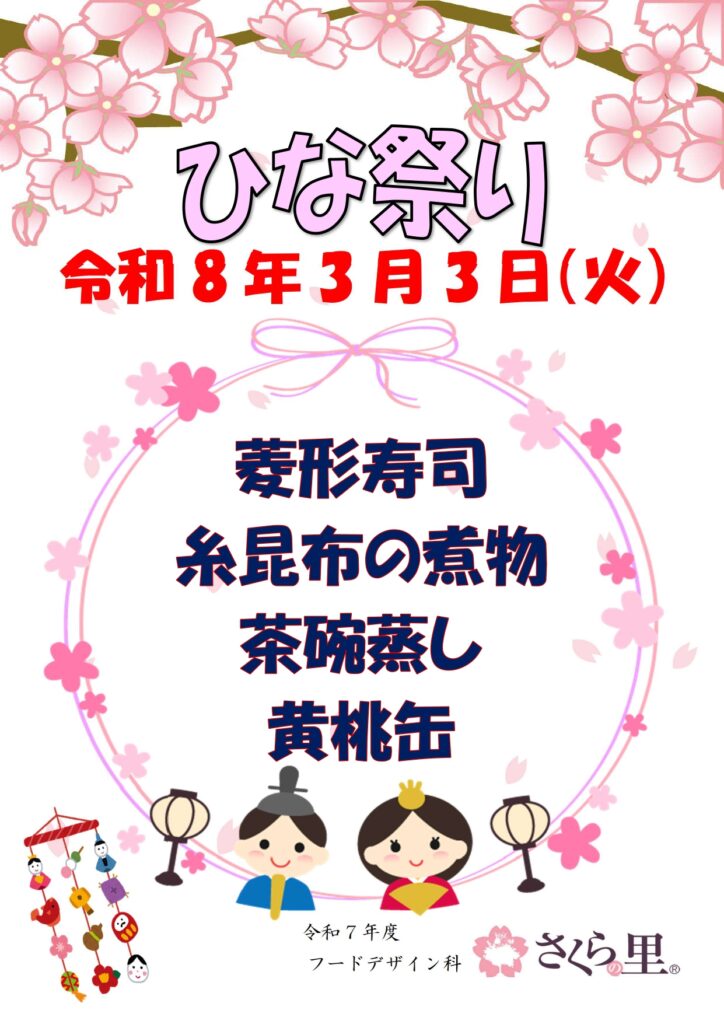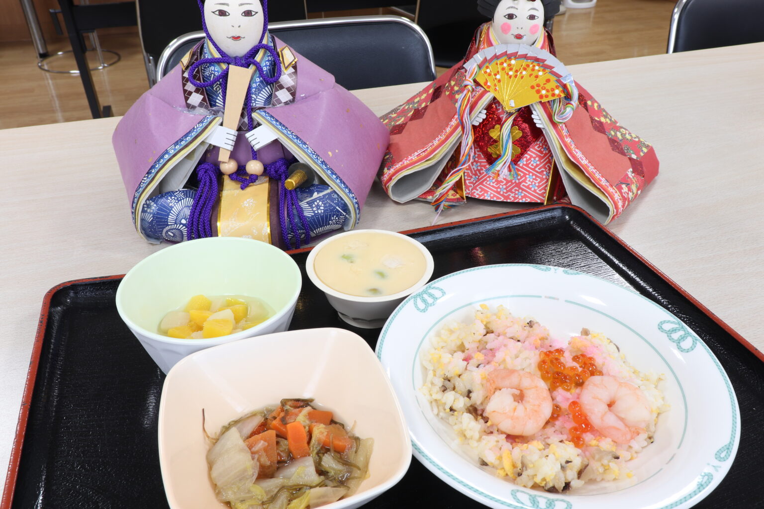 本日は行事食「ひな祭り御膳」を提供させていただきました。参加いただきました皆様、ありがとうございました!(メニューは菱形寿司、糸昆布の煮物、茶碗蒸し、黄桃缶でした!)