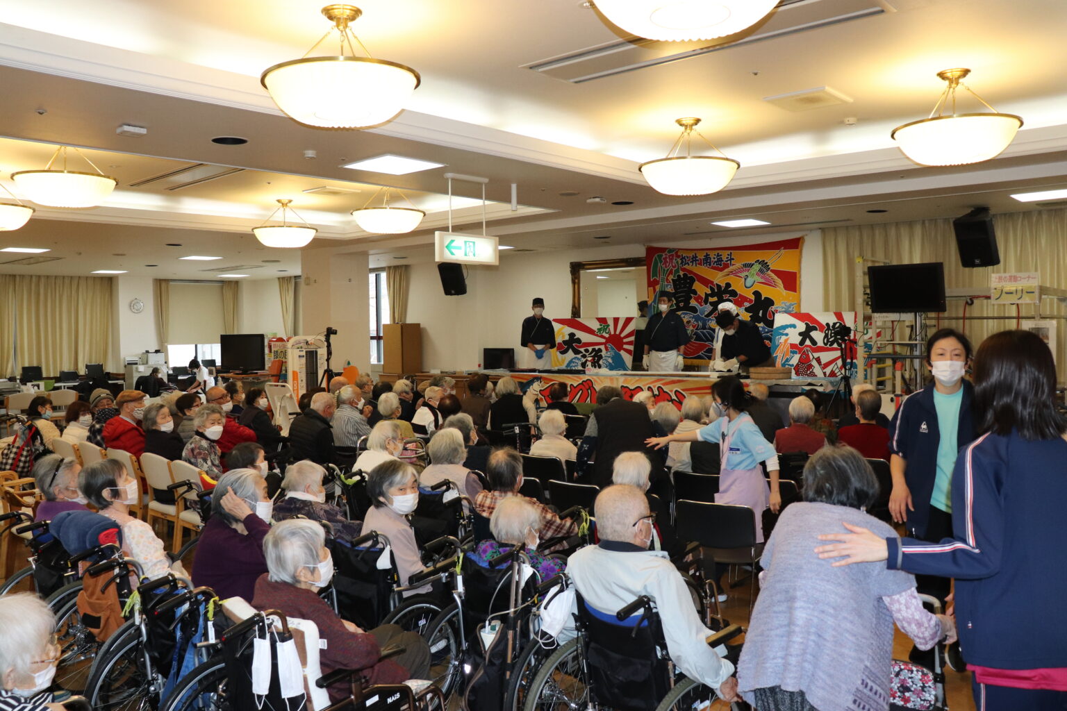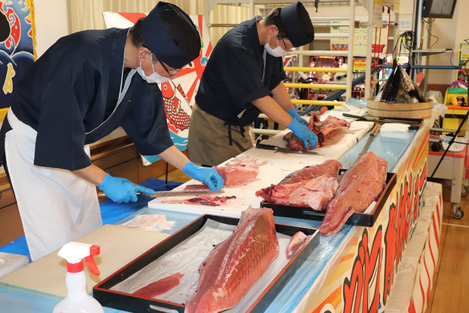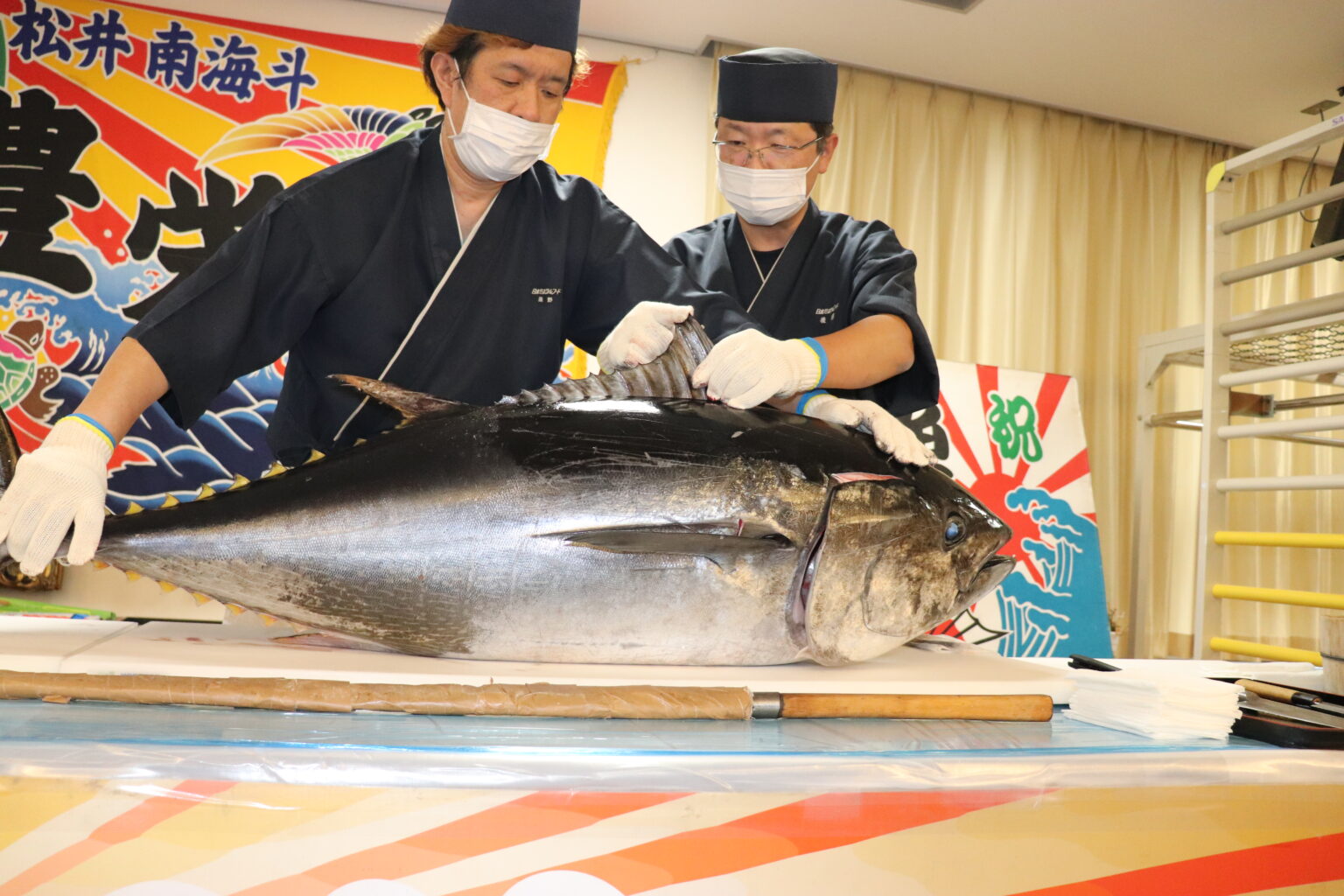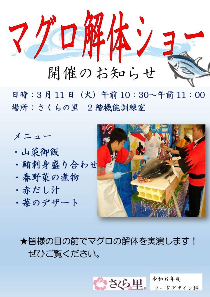 3月11日(水)10:30より、通所リハビリセンターや入所をされている利用者様を招待し、さくらの里2F機能訓練室にてマグロの解体ショーを5年ぶりに開催しました!今回は長崎県産黒マグロを使用しました!