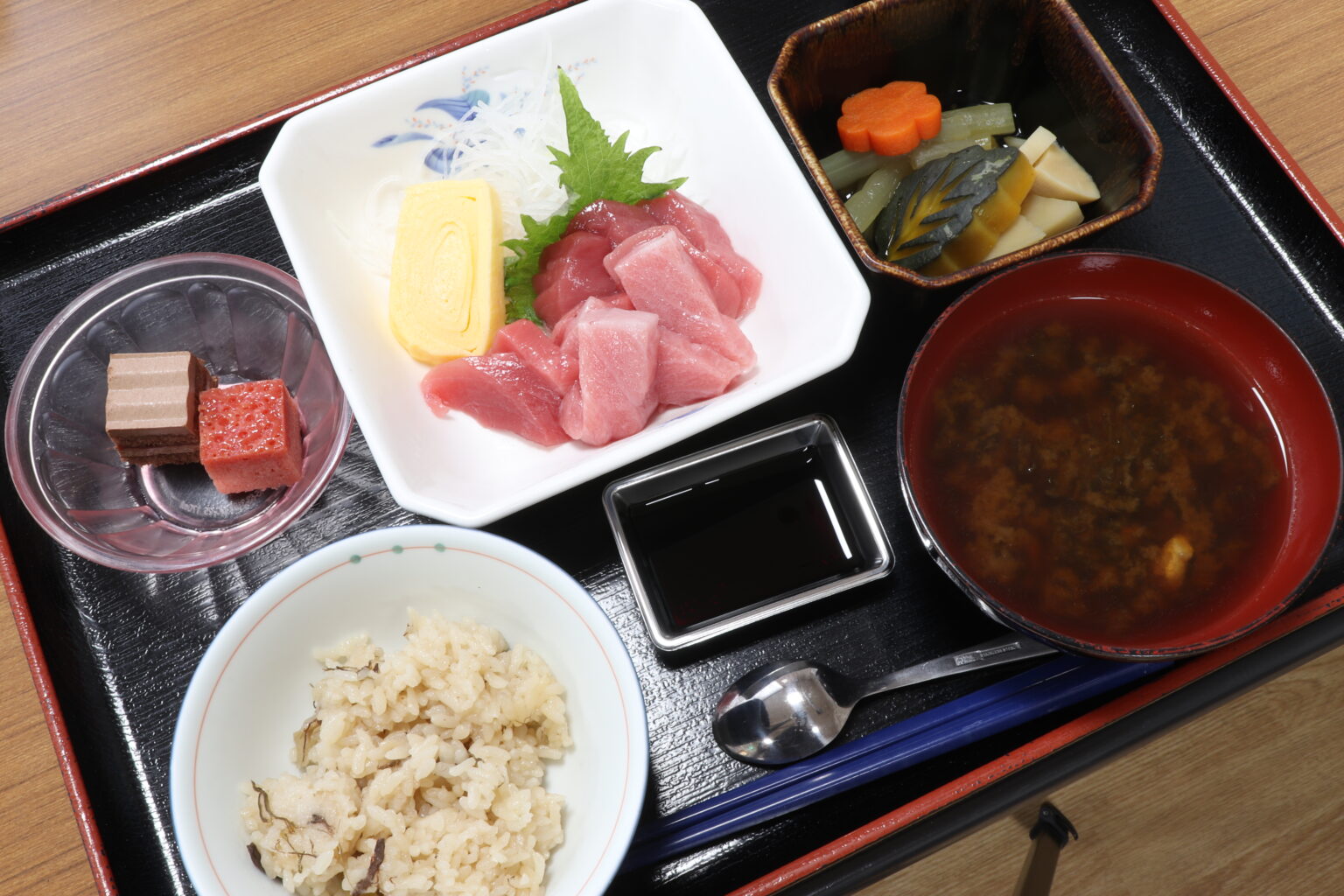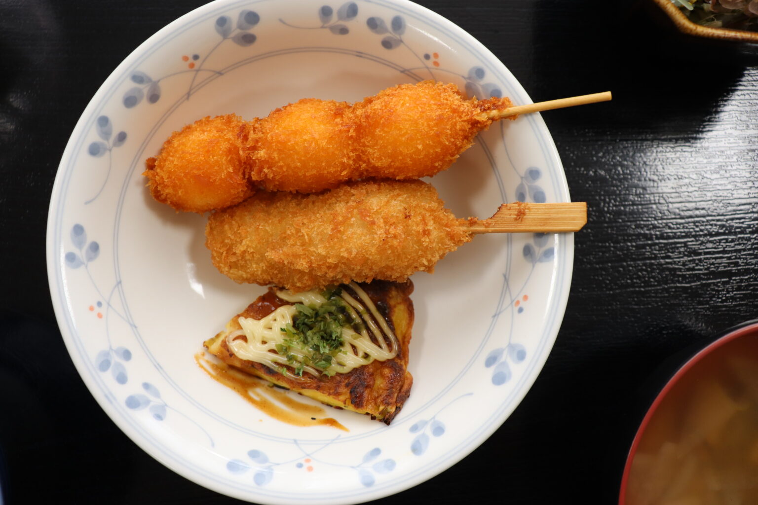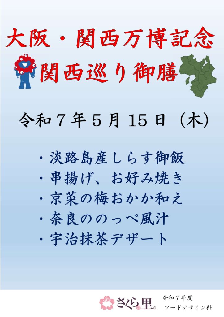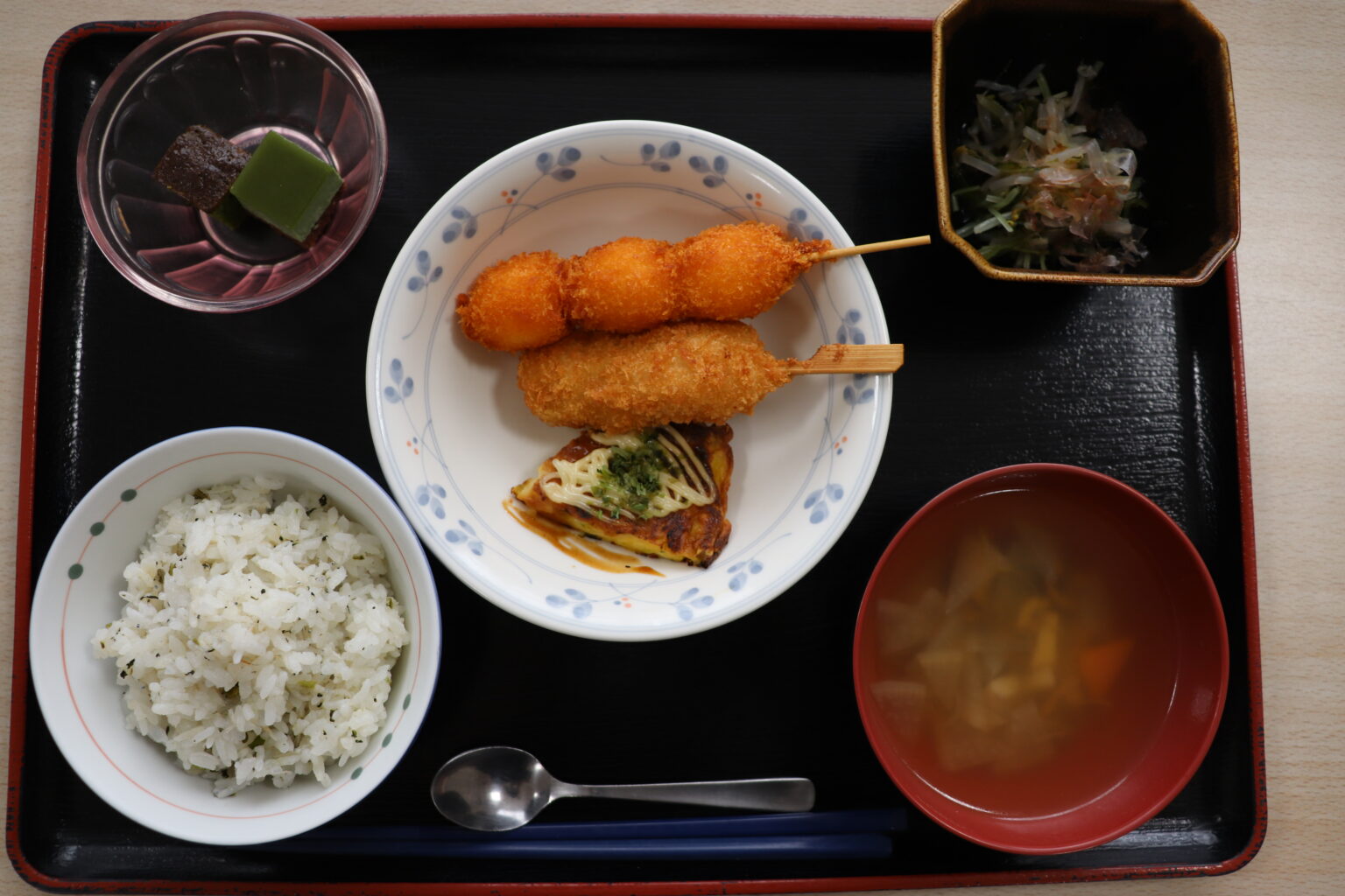 本日は行事食「大阪・関西万博記念 関西巡り御膳」を提供させていただきました。参加いただきました皆様、ありがとうございました!(メニューは淡路島産しらす御飯、串揚げ、お好み焼き、京菜の梅おかか和え、奈良ののっぺ風汁、宇治抹茶デザートでした!)