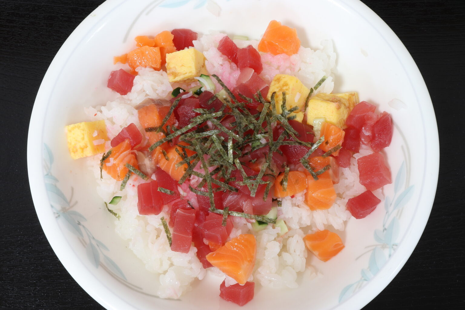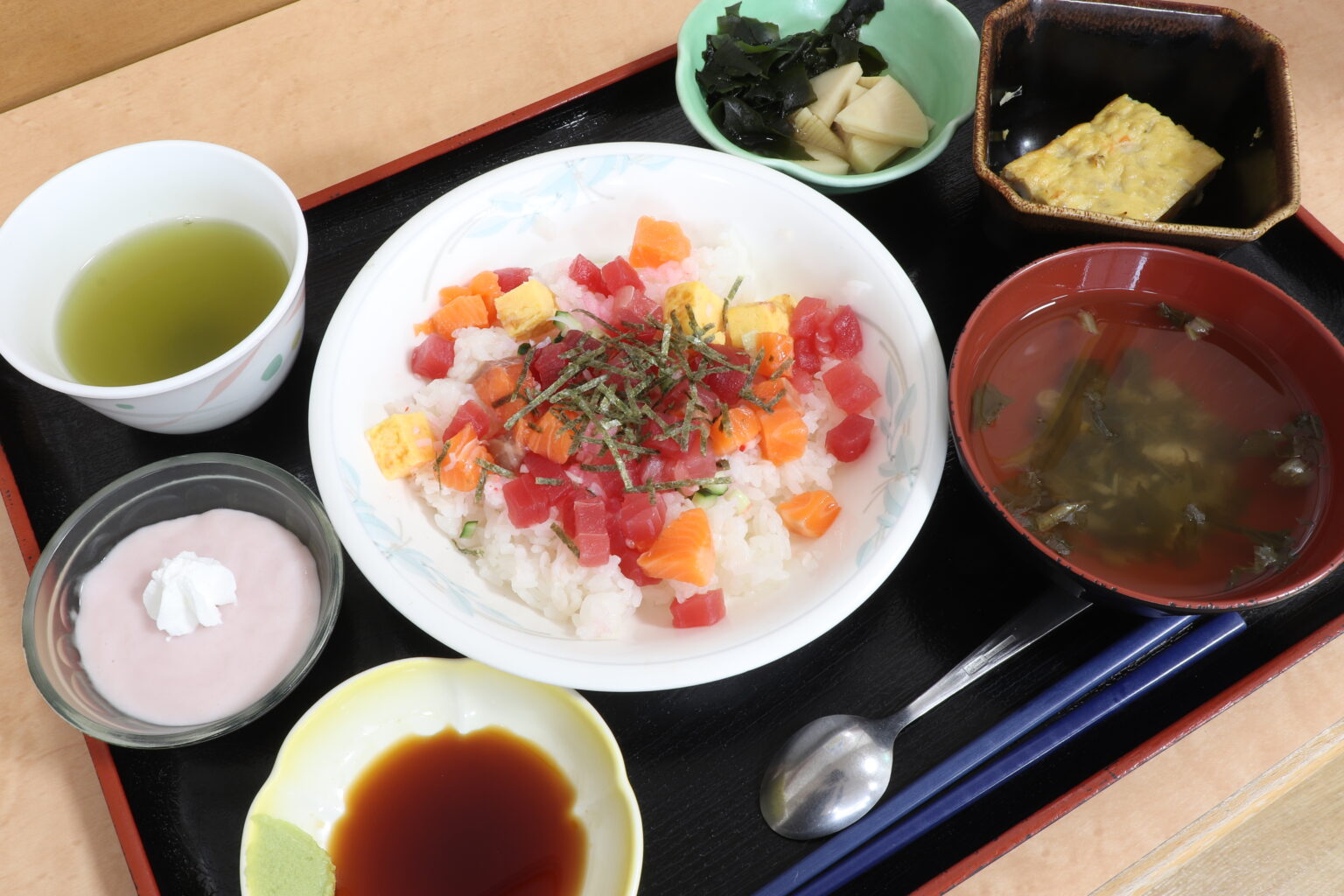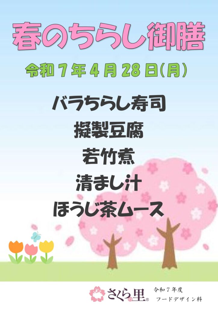 本日は行事食「春のちらし御膳」を提供させていただきました。参加いただきました皆様、ありがとうございました!(メニューはバラちらし寿司、擬製豆腐、若竹煮、清まし汁、ほうじ茶(いちご)ムースでした!)