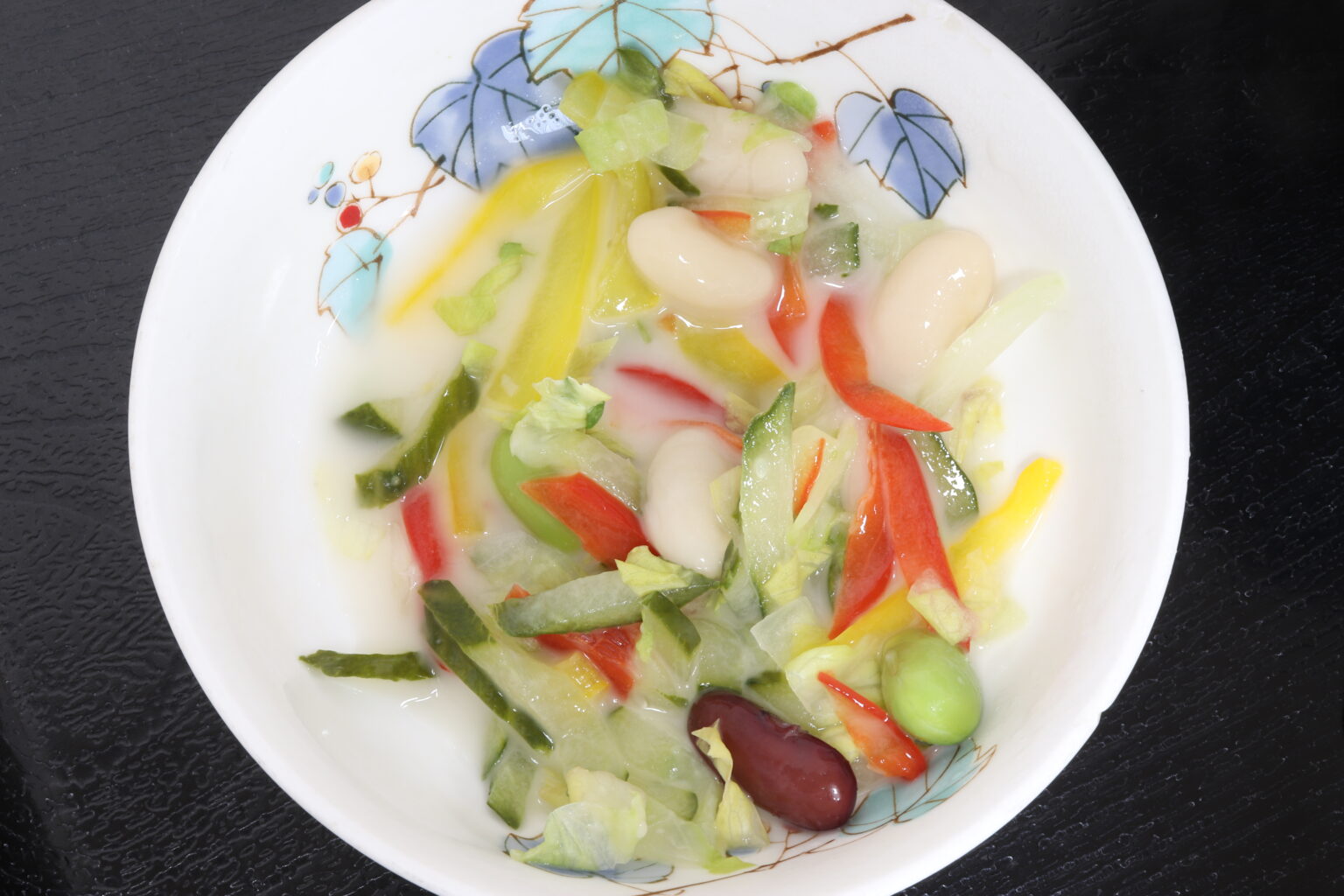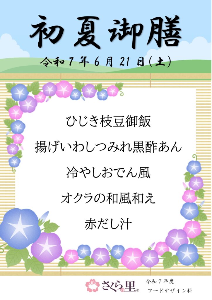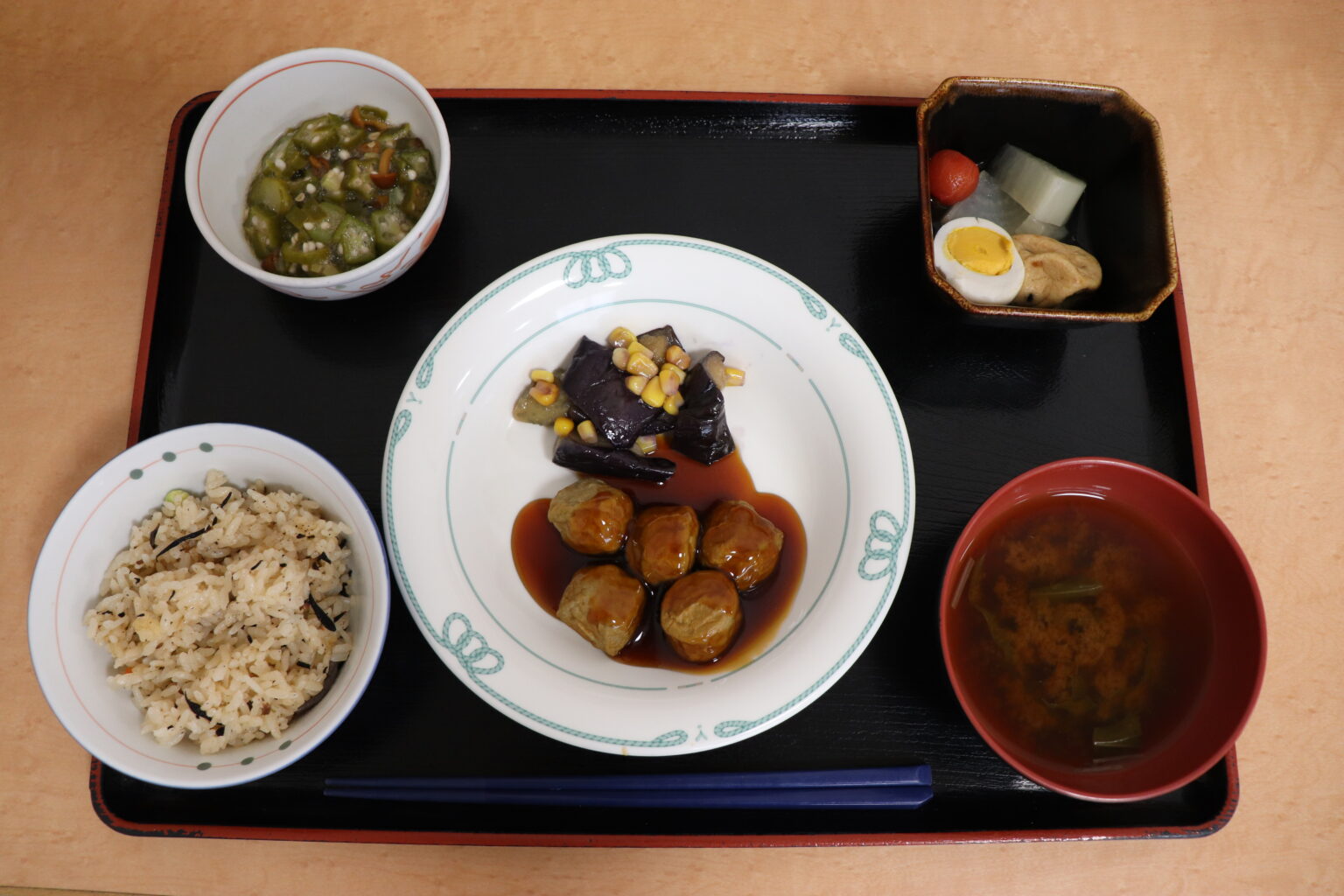 本日は行事食「初夏御膳」を提供させていただきました。参加いただきました皆様、ありがとうございました!(メニューはひじき枝豆御飯、揚げいわしつみれ黒酢あん、冷やしおでん風、オクラの和風和え、赤だし汁でした!)