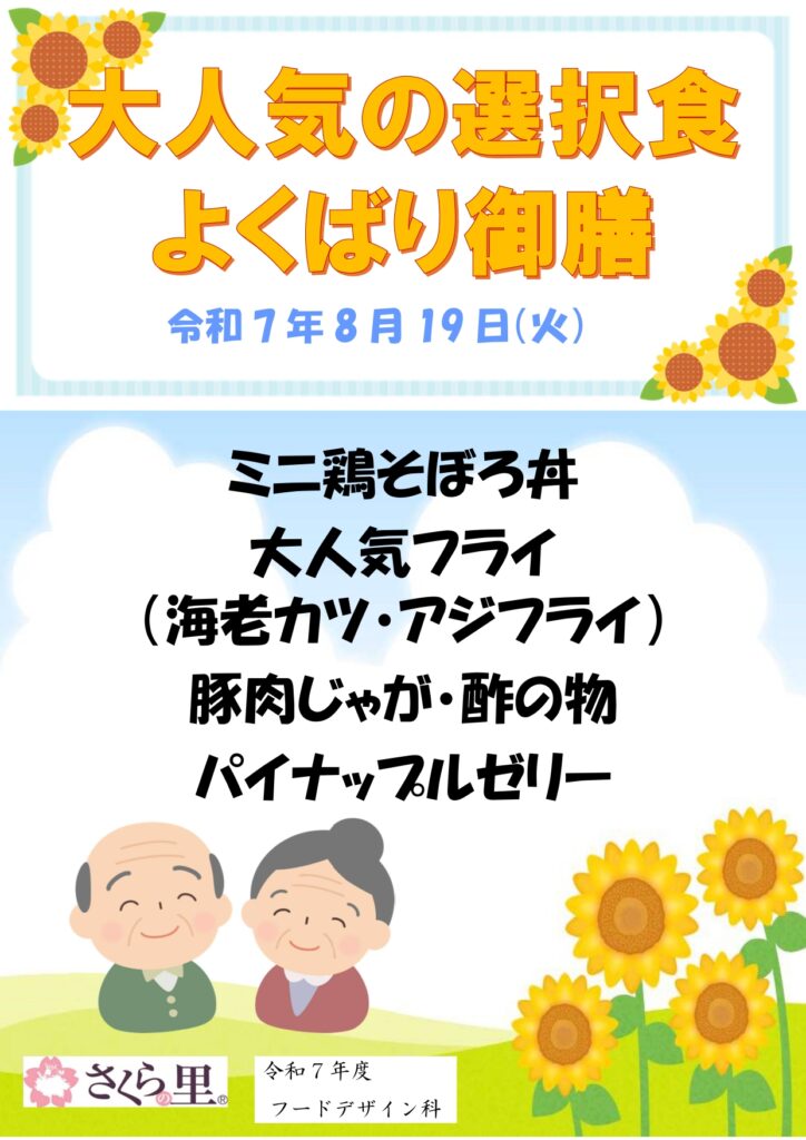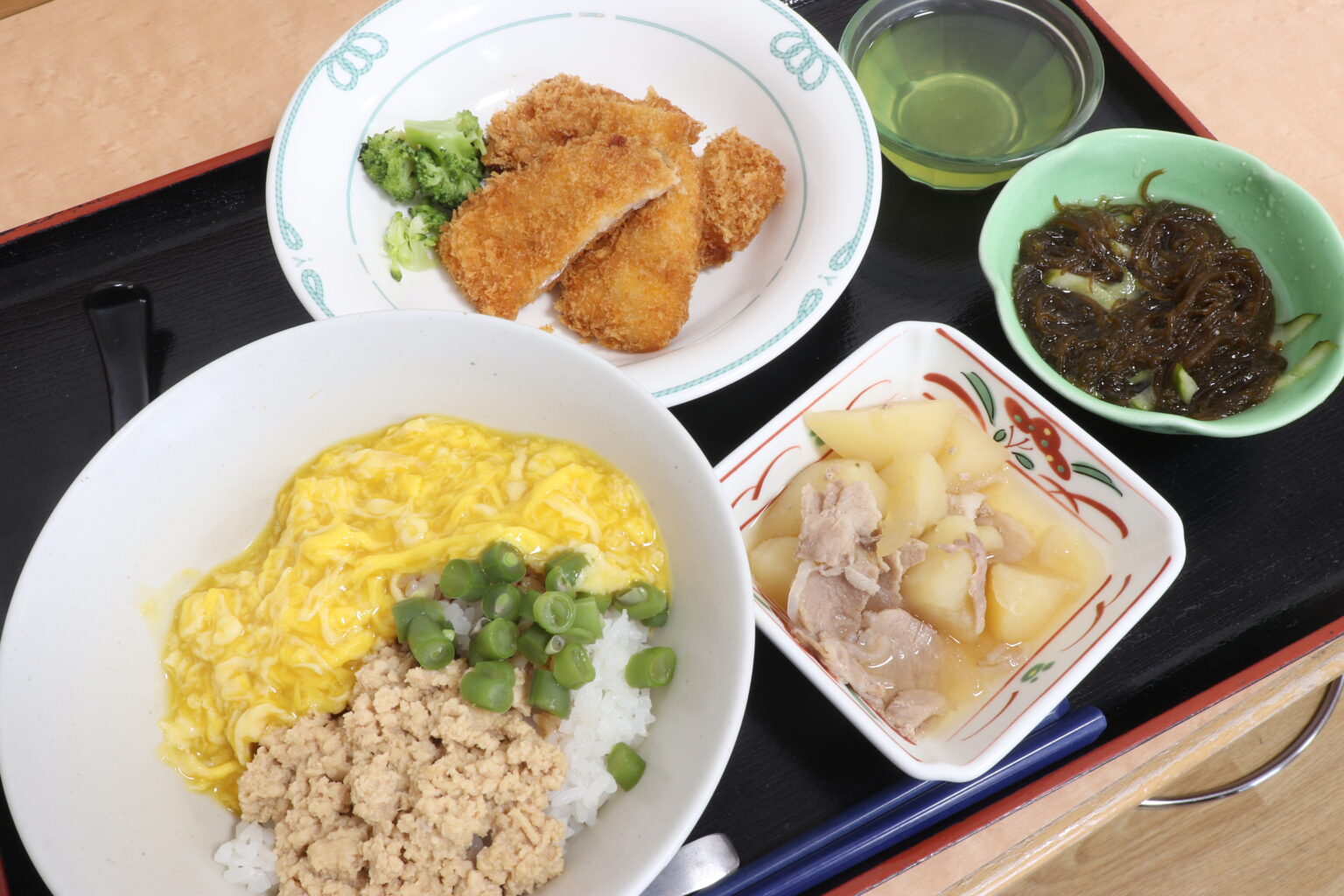 本日は行事食「大人気の選択食よくばり御膳」を提供させていただきました。参加いただきました皆様、ありがとうございました!(メニューはミニ鶏そぼろ丼、大人気フライ(海老カツ・アジフライ)、豚肉じゃが、酢の物、パイナップルゼリーでした!)