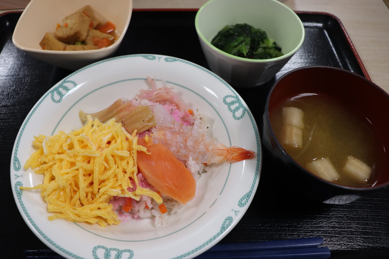 本日は行事食「春のちらし御膳」を提供させていただきました。参加いただきました皆様、ありがとうございました!(メニューはさくらのちらし寿司、絹豆腐の煮物、しろ菜の和え物、味噌汁でした!)