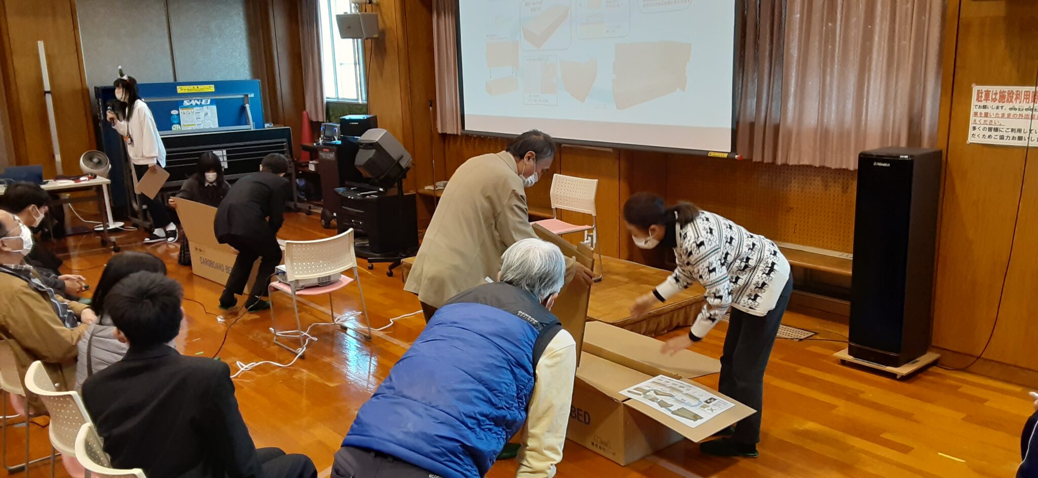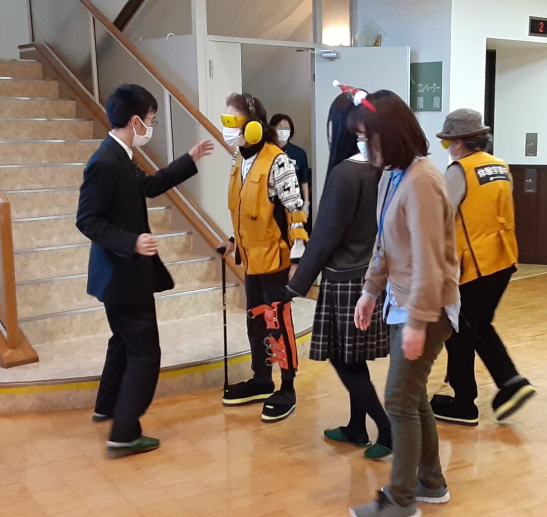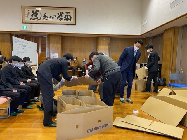 講座は、2部構成で第1部:東日本大震災を経験した花木様のお話、小倉様による防災クロスロードゲームを楽しみ 第2部:段ボールベッド組み立て体験、高齢者疑似体験をすることで災害時の避難場所での高齢者の大変さを学ぶことができました。