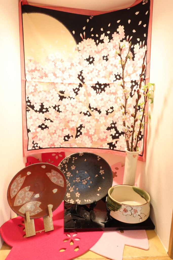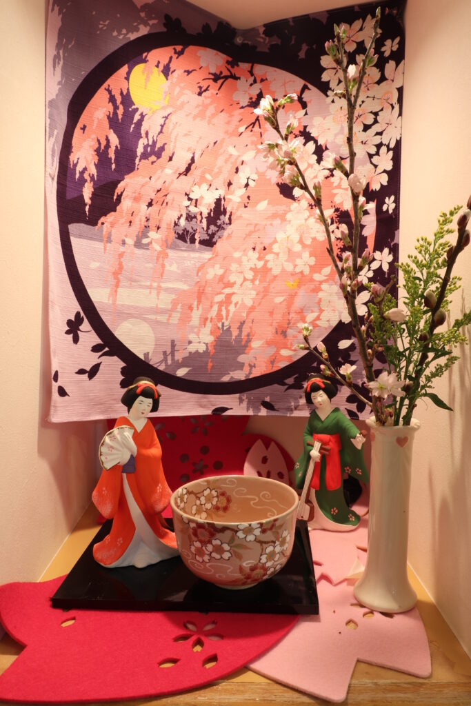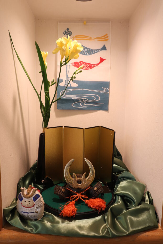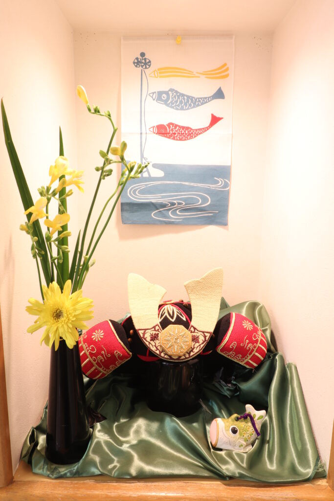 相談室前のお花の様子です(右のこいのぼりオブジェがゲーミングPCのように光ってます)