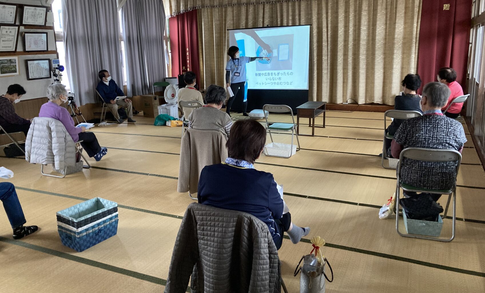 非常用携帯トイレの上手な使い方や、新聞紙で作った天使の輪の利用のし方、簡易段ボールトイレなど、実演を交えて行いました。