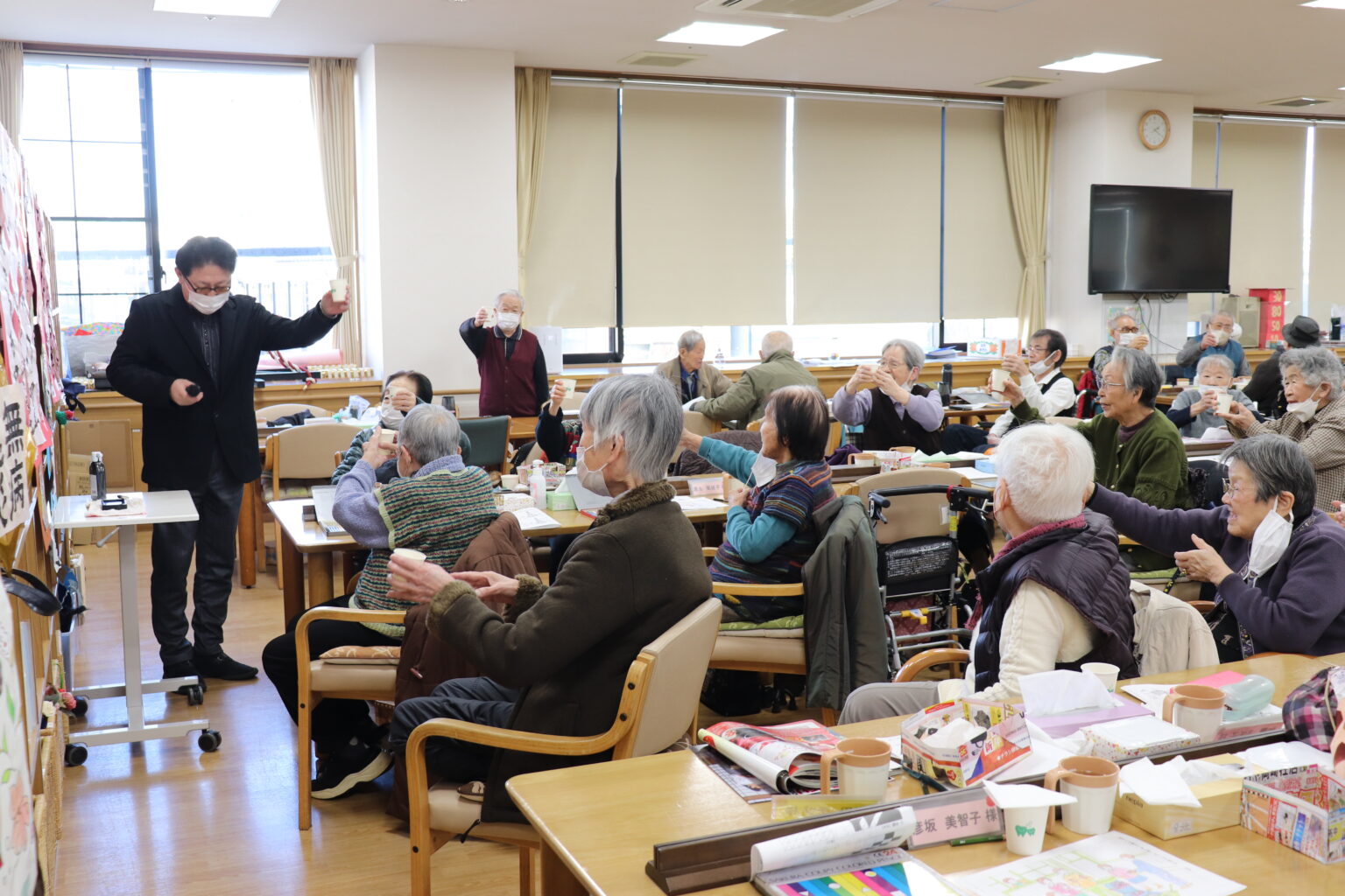 レク企画委員が各フロアに杵臼を台車に乗せて回りました。利用者様に本格的な餅つきに参加していただくことで、新年の時候を感じていただくことができました!