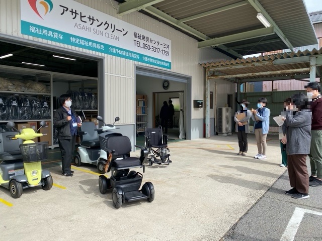 令和5年3月13日 3包括合同(社会福祉協議会、竜美、さくらの里地域包括支援センター)で「ケアマネ交流会」を開催しました。今回の交流会は、新しく三河に事業所を開設したアサヒサンクリーン福祉用具事業所様のご厚意で、倉庫、駐車場を会場にお借りし、また事前にケアマネジャー事業所のご要望を伺い、体験型の講義講習等行っていただきました。新人ケアマネジャーからベテランケアマネジャーまで18名、包括8名が参加して下さり、久しぶりの実体験交流会でおしゃべりを交え楽しく、新しい機種、道具やGPS付電動カート等の説明やコース実動体験ができました。
