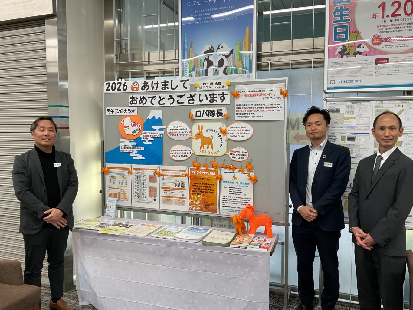 2025年10月15日三井住友信託銀行様にて、認知症について学ぶ「認知症の人にやさしい企業サポーターONEアクション研修」の出前講座を開催しました。その後、地域貢献として三井住友信託銀行様より「1月にさくらの里地域包括支援センターによる取り組みなどロビー展示をしてはどうか?」とご提案頂きました。この機会に岡崎市地域包括支援センターの取り組みや認知症についての情報、また「岡崎ごまんぞく体操」について展示しました。