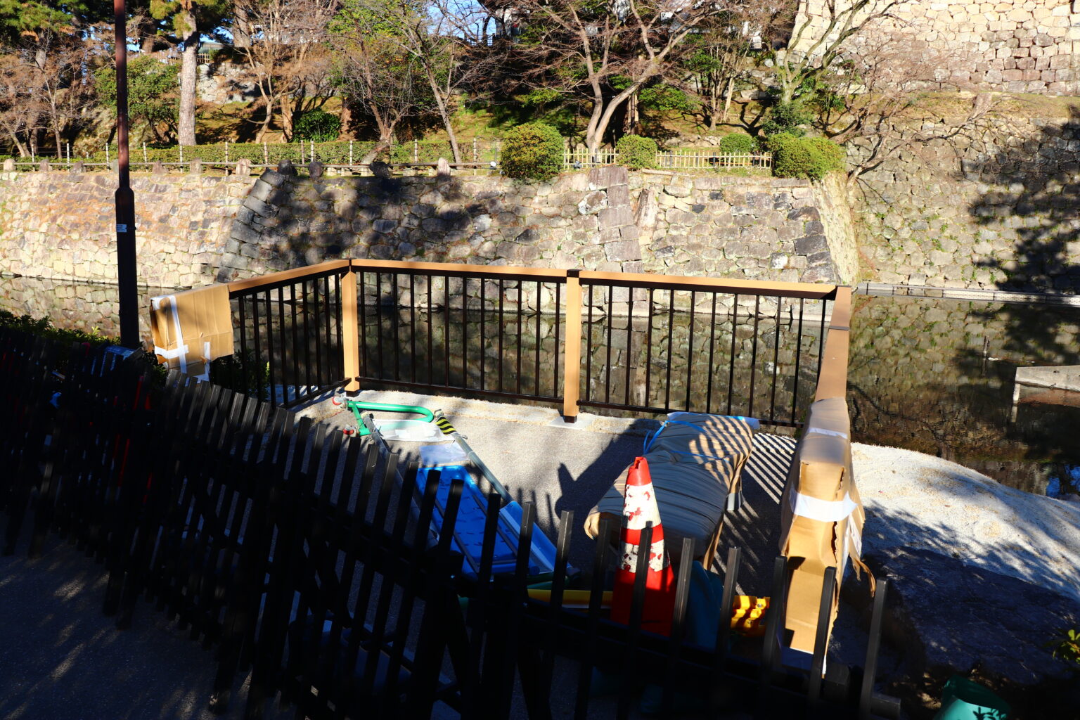 お堀付近に柵を設置中でした(以前に松の木と灯籠があった場所です)